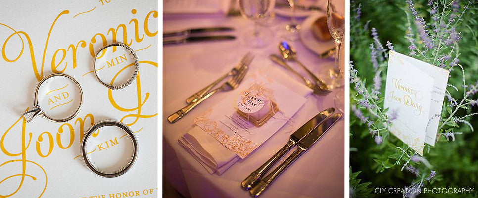 All of our items are printed luxe card stocks in your choice of finish; metallic, linen, matte, and cotton. You can choose from our commonly used ink colors or request a custom color match. Everything we do is custom and personalized to your event.